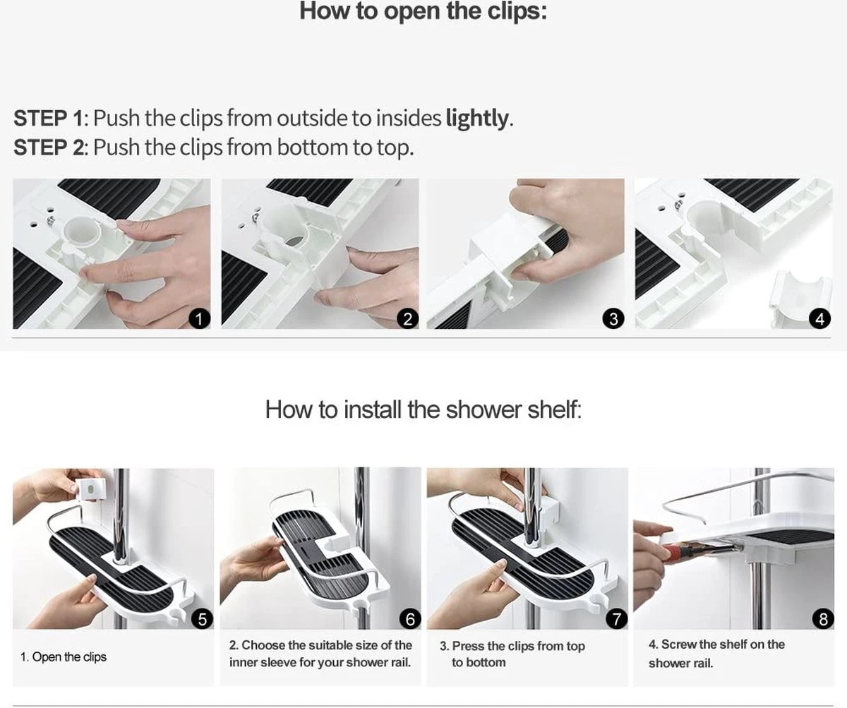 1. Omheiningsontwerp: onze telescopische plank van deze douchecaddy-paal met 90 graden rechte hoekkromme omheining, wetenschappelijk ontwerp van ergonomie, vermijd volledig de gewone hoek die onnodige krassen veroorzaakt en voorkomt dat de flessen vallen, waardoor schade effectief wordt veroorzaakt.