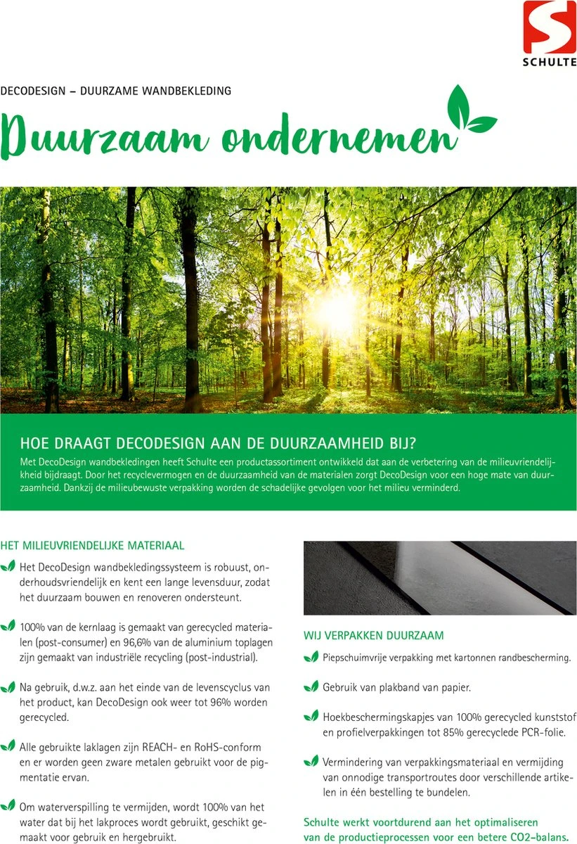 Schulte Schulte-home is een gerenommeerd fabrikant gevestigd in Duitsland in het mooie Sauerland daar waar het assortiment douchecabines geheel in eigen huis worden geproduceerd. Decodesign-achterwanden zijn daar ook een onderdeel van. Speciaal voor natte ruimtes als wandbekleding met een lange levensduur en hoge kwaliteit. Snelle levering en een Decodesign garantie van 5 jaar.
