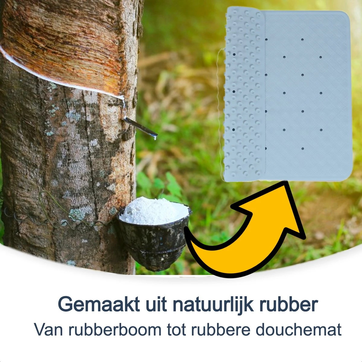 Deze mat is gemaakt van natuurrubber uit het sap de rubberboom. Het is een duurzaam en waardevol proces.Terwijl de boom aan het groeien is en rubber aan het produceren is absobeert het gelijktijdig koolstofdioxide en produceert het zuurstof. Als de boom na 30 tot 40 jaar klaar is met produceren en gekapt moeten worden, worden hier meubels van gemaakt.