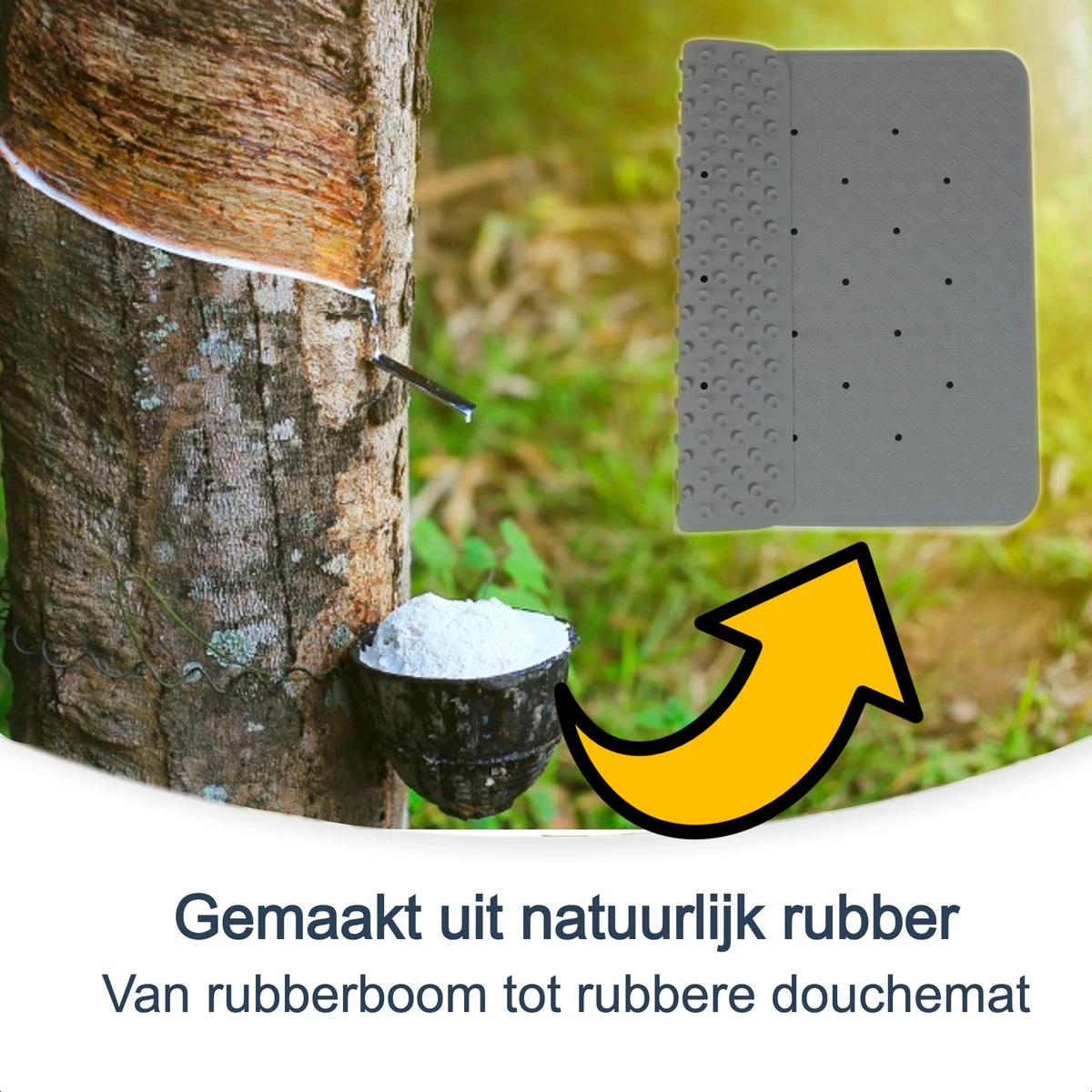 Deze mat is gemaakt van natuurrubber uit het sap de rubberboom. Het is een duurzaam en waardevol proces.Terwijl de boom aan het groeien is en rubber aan het produceren is absobeert het gelijktijdig koolstofdioxide en produceert het zuurstof.