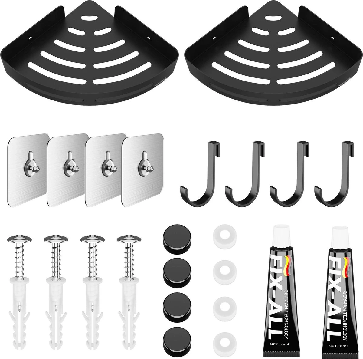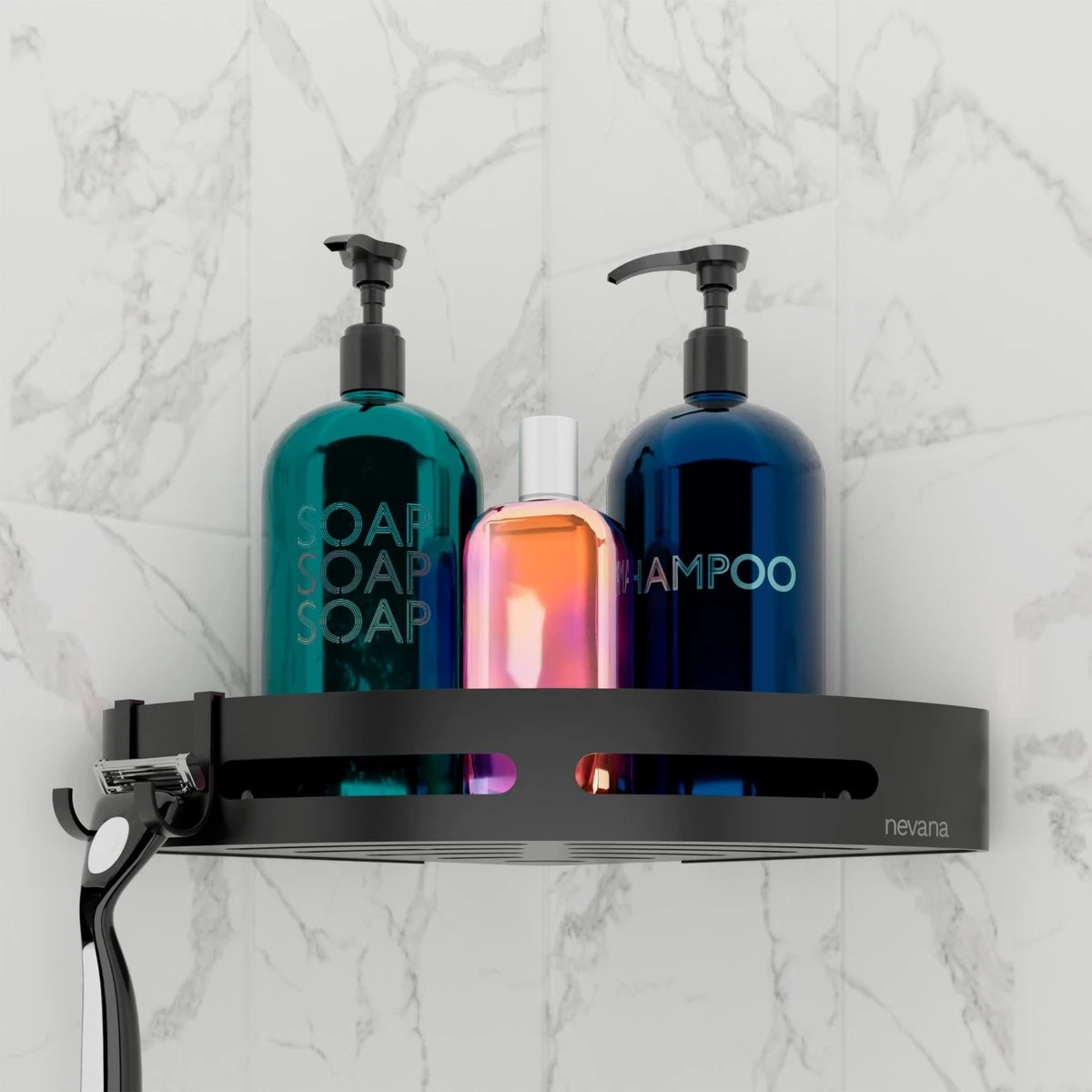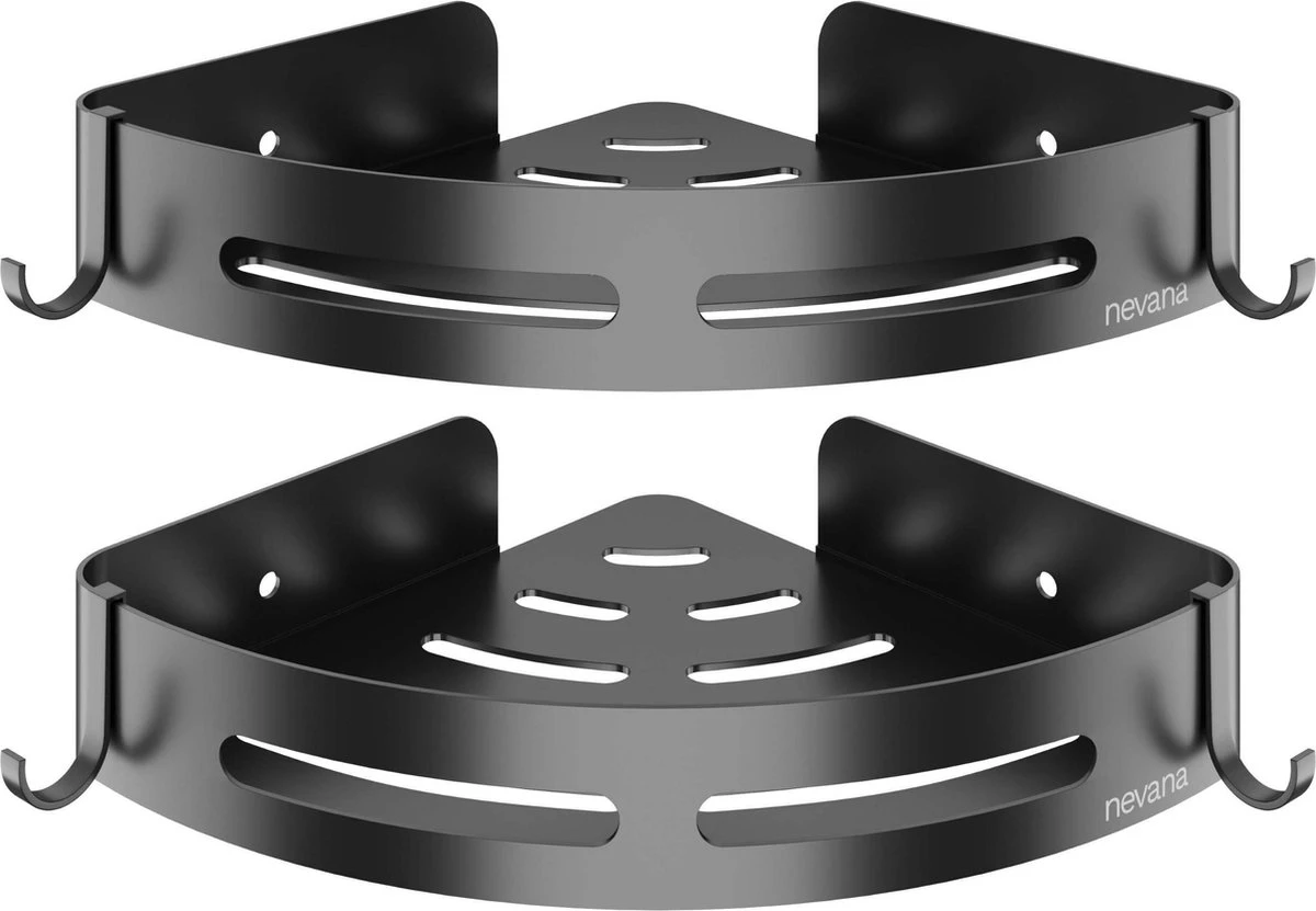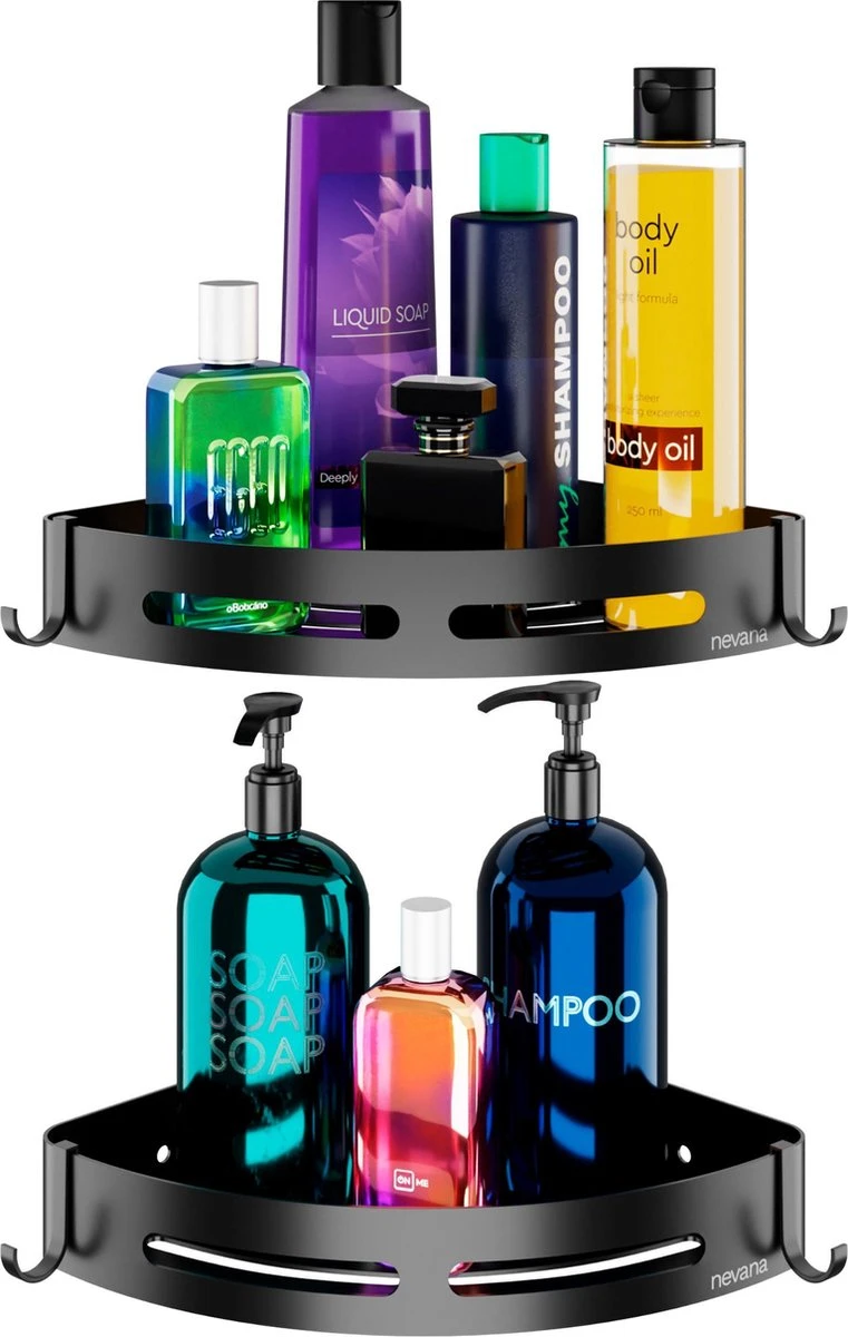 Nooit meer struikelen over je shampoo flessen. Met het Nevana doucherek heb je genoeg ruimte om al je spullen kwijt te kunnen. Aan de handige haakjes hang je bijvoorbeeld ook je sponzen op. Door de hoge kwaliteit van het materiaal is het doucherek geheel water- en vochtbestendig. Het stijlvolle ontwerp maakt het doucherek geschikt voor ieder interieur. Je zult er dus jarenlang plezier van hebben. Dankzij de drie verschillende bevestigingsmethoden is het doucherek op ieder oppervlak makkelijk te monteren, ook zonder boormachine!