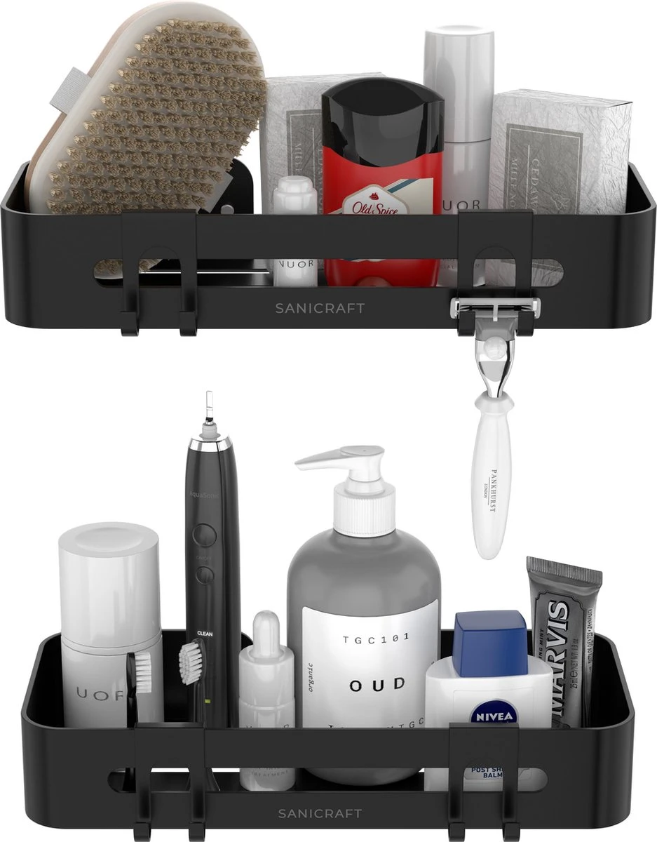 Met het 2-laagse doucherekje van Sanicraft® creëer je een opgeruimde en stijlvolle badkamer. Nooit meer omvallende flessen shampoo op de badkamervloer. Of scheermesjes die van de badrand afvallen. Voortaan heb je alles wat je nodig hebt binnen handbereik. En dat zonder te boren! Dit doucherekje komt met een supersterke lijm die geschikt is voor elk type muur. Zonder de muur te beschadigen. Bestel nu en geef je badkamer een moderne uitstraling!