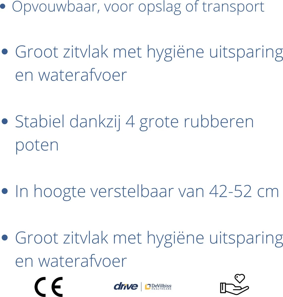 - De anti-slip doppen aan de poten van de opvouwbare douchestoel helpen voorkomen dat de douchestoel tijdens het gebruiken verschuift.
