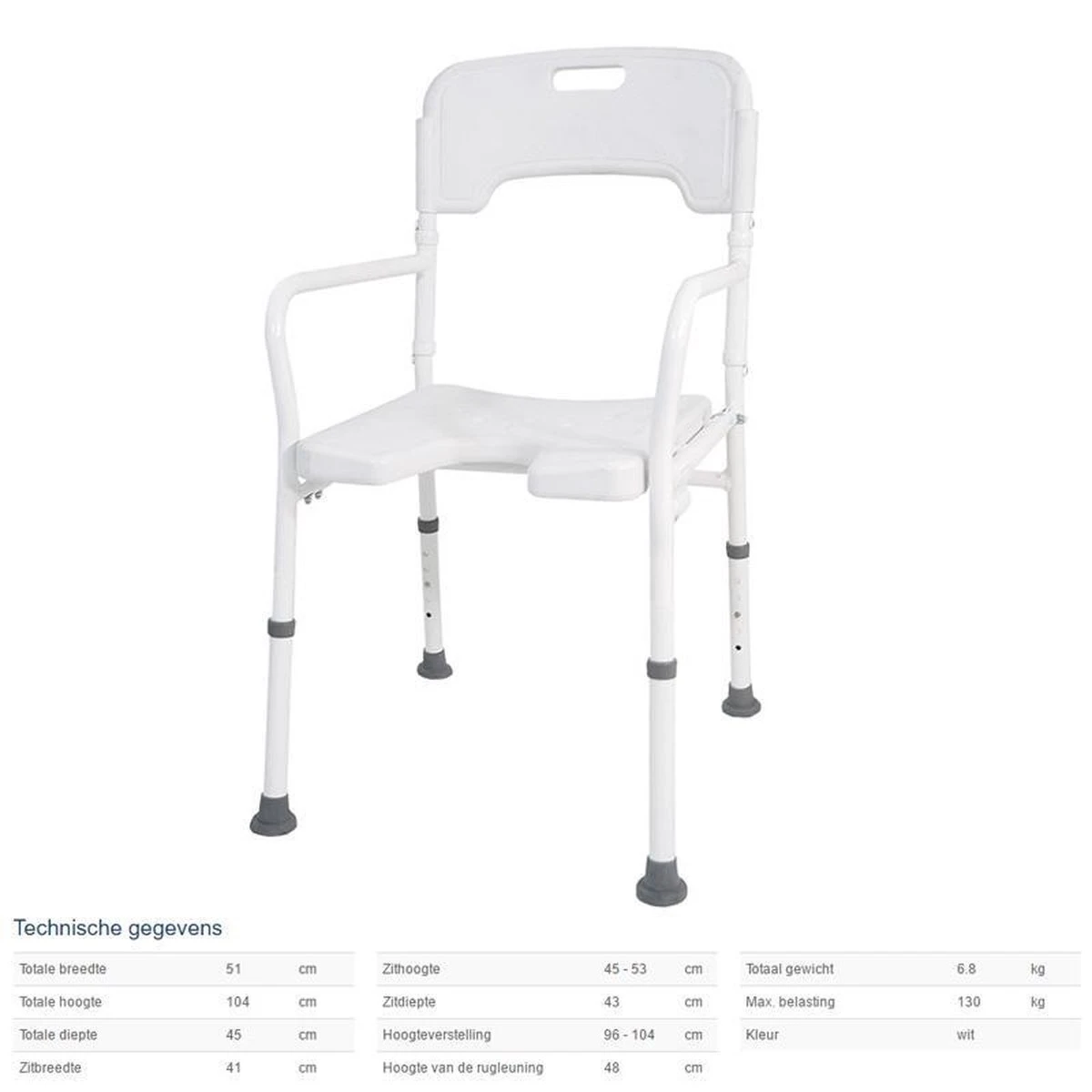Met een maximaal gebruikersgewicht van 130 kilogram en een relatief brede zitting is de opvouwbare douchestoel van Drive geschikt voor nagenoeg iedere gebruiker en kan deze universeel worden ingezet voor meerdere gebruikers in een woning of een instelling.