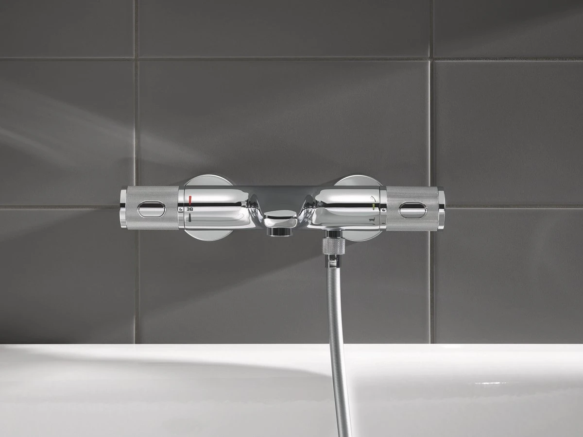 Geniet van een soepele bediening en optimaal schoonmaakgemak met de GROHE Precision Feel thermostatische badmengkraan. Deze badkraan is voorzien van een bad- en douche-uitloop en monteer je in een oogwenk naadloos aan de wand. De GROHE ProGrip ergonomische handgrepen zorgen voor een moeiteloze bediening van de kraan; zelfs wanneer je handen onder het schuim zitten! Daarbij is de set uitgerust met diverse veiligheidsfuncties waardoor het hele gezin kan genieten van onbezorgde momenten in bad en onder de douche. Via de GROHE SafeStop Plus knop kun je de watertemperatuur limiteren op 38°C zodat kinderen veilig kunnen douchen zonder zich te verbranden aan heet water. GROHE CoolTouch zorgt ervoor dat de thermostaat niet te heet wordt voor een optimale bescherming van de huid.