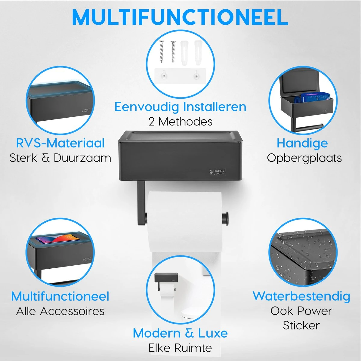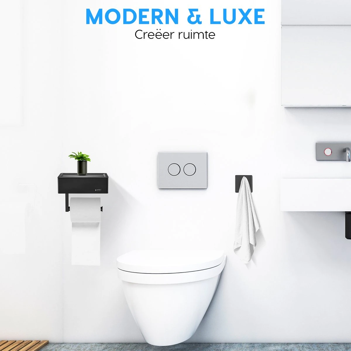 Happy Goods – WC Rolhouder Zonder Boren Zwart – Toiletrolhouder Met Plankje En Bakje RVS – Met Handdoekhaakje
