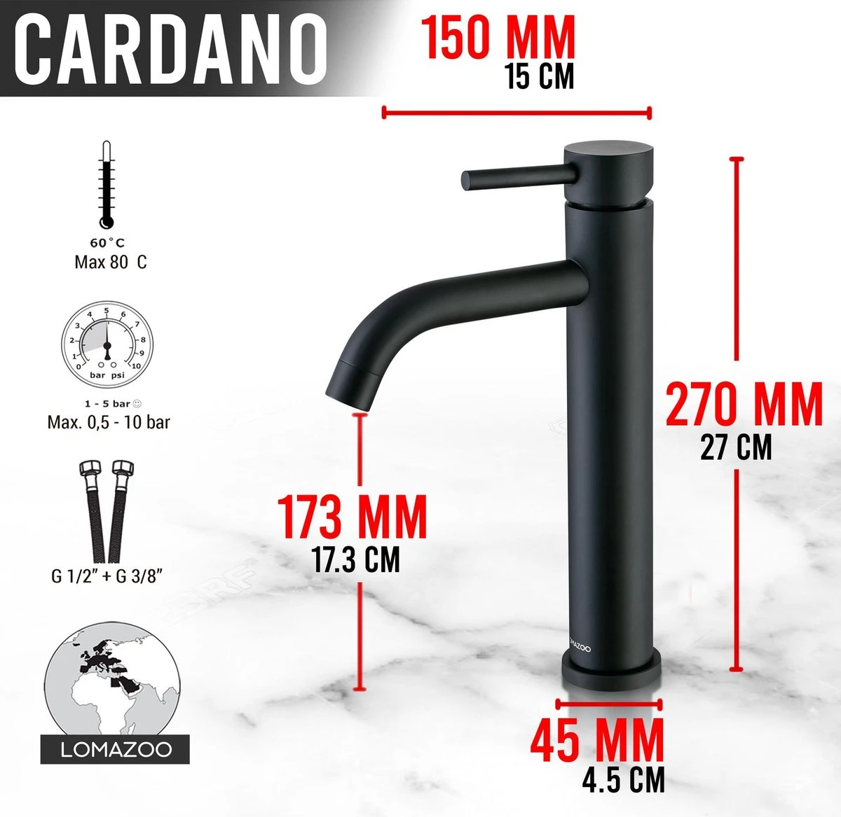 - Hoogte wastafelkraan: 270 mm