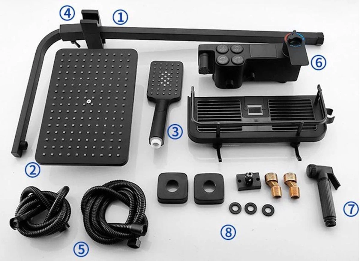 Merkloos Compleet Douchesysteem | ABS Doucheset | Mat Zwarte Hoofddouche En Handdouche | Vierkante Regendouche Voor Badkamer | Verstelbaar | Temperatuur Display | 360° Draaibaar