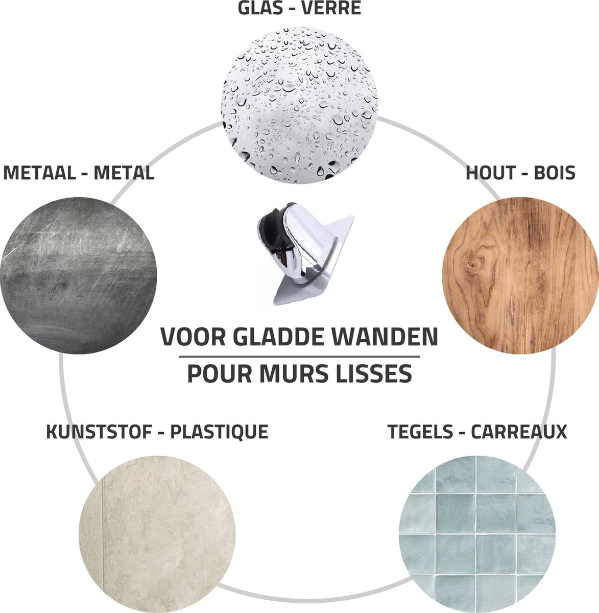 Geschikt voor gebruik op gladde oppervlakken als tegels, glas, kunststof en metaal. Voor het beste resultaat laat je de sticker eerst even goed hechten (liefst 12-24 uur) voordat je er volle belasting er op zet. De douchekop kan er natuurlijk gelijk in.