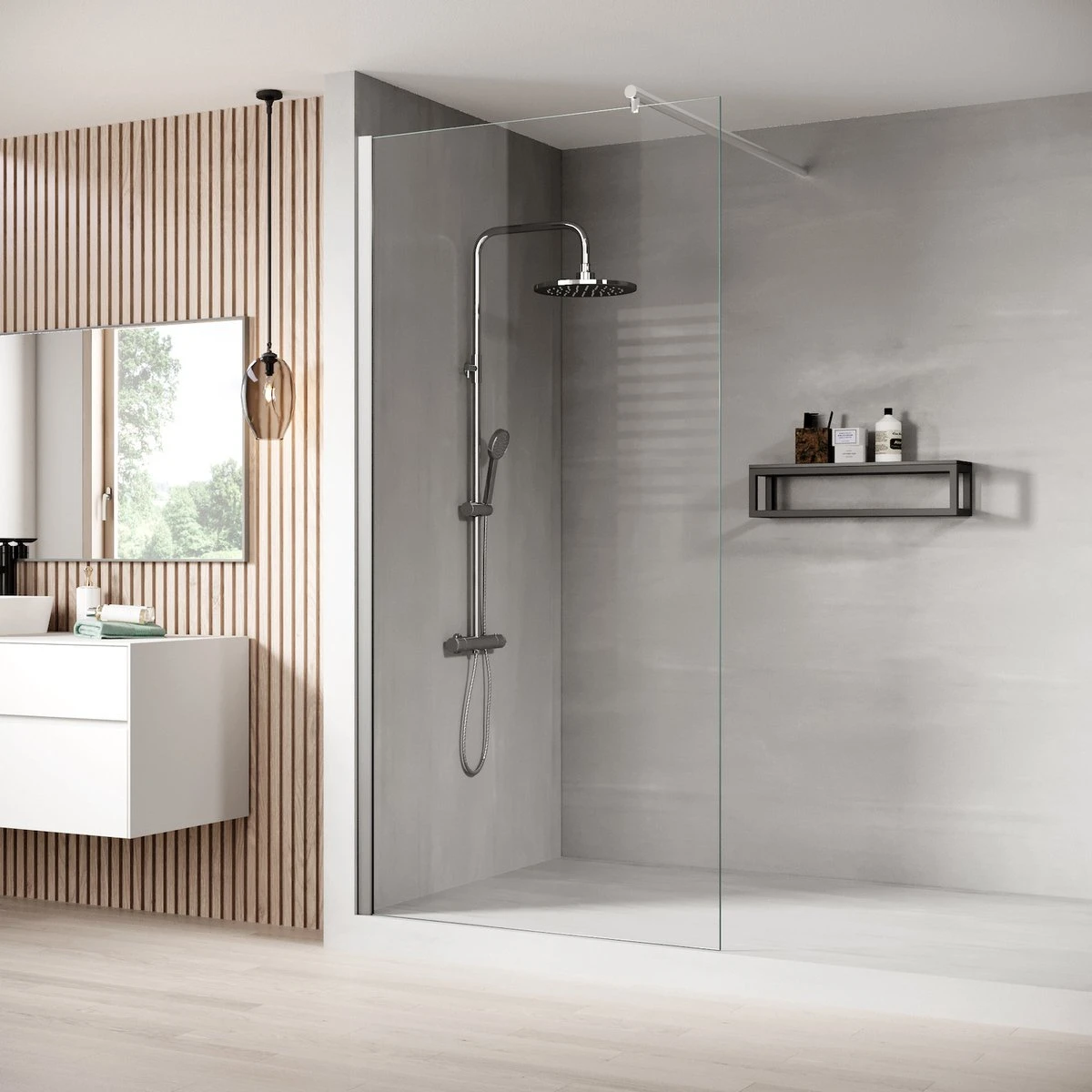 Douchewand 60cm gemaakt van 8mm dik veiligheidsglas voorzien van nano coating. Afmeting 60 x 200cm.De inloopdouche wordt geleverd met een stabilisatiestang van 100 cm breed, wandprofiel en montagemateriaal.