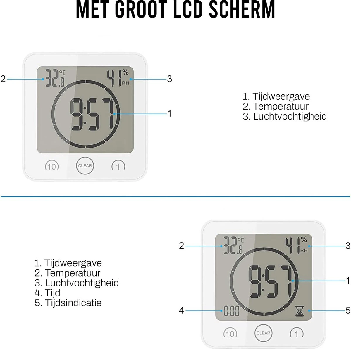 Wil jij water én tijd besparen tijdens het douchen? Deze 4-in-1 douchetimer van Podec helpt je daarbij. De douche klok heeft een overzichtelijk lcd scherm. Daarop kun je de tijdweergave, temperatuur, luchtvochtigheid, tijdsindicatie (zandloper) en aftelfunctie zien. Met deze showertimer bespaar je niet alleen water, maar draag je ook bij aan een beter klimaat!