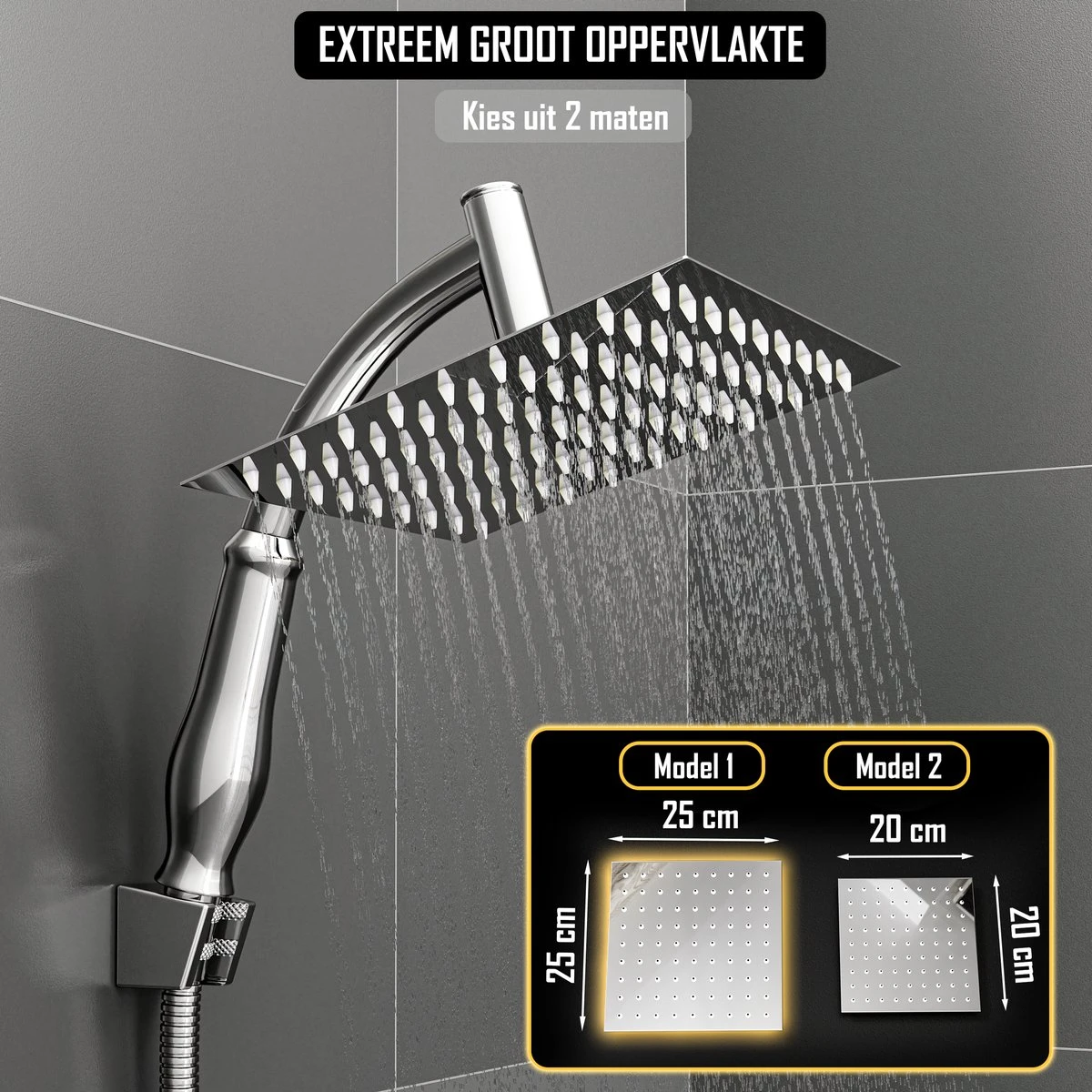 Inhoud pakket: Regendouchekop Deluxe (SS304-Materiaal) | 2 Verlengstukken voor handstuk (ABS-Materiaal)| 1 Bijbehorende doucheslang van 1.5M (SS304-Materiaal) | 1 Douchekop-houder (SS304-Materiaal) | Bijbehorende set schroeven en pluggen | Nederlandse Installatiehandleiding