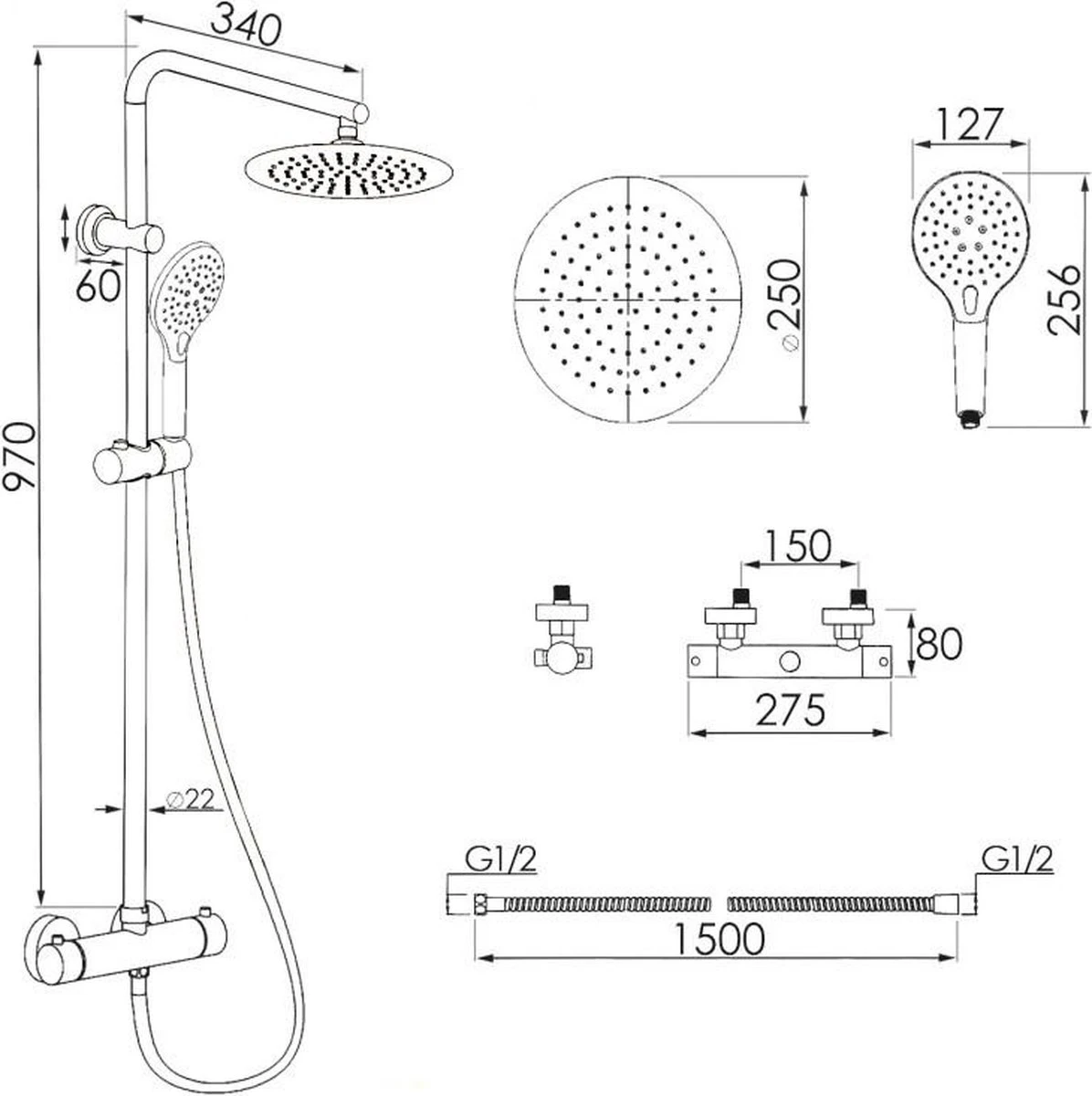 De set bevat een hoogwaardige thermostaatkraan met debietregeling en een watertemperatuurmengkraan, evenals een douchekolom met een mooie 25 cm regendouche en een switch tussen deze en de handset. De kraan heeft de functie van nauwkeurige temperatuurinstelling, die u in combinatie met de warmwaterstop op 38°C de zekerheid geeft van hoog comfort en veiligheid bij het douchen. De douchekop is daarentegen voorzien van twee waterstroomstanden die met een knop op de handgreep kunnen worden veranderd.