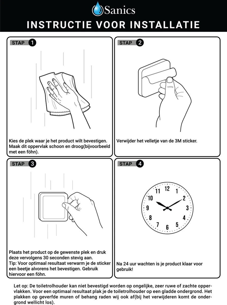 Let op: De toiletrolhouder kan niet bevestigd worden op ongelijke, zeer ruwe of zachte oppervlakken. Voor een optimaal resultaat plak je de toiletrolhouder op een gladde ondergrond. Het plakken op geverfde muren of behang raden wij ook af(bij het verwijderen komt de ondergrond wellicht los).