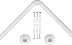 Per uiteinde boort u 3 gaten in de muur op de positie waar de pluggen komen. De witte wandbevestiging schroeft u tegen de muur aan en daar bevestigd u de stang aan. De afdekvoeten shuift u over de wandbevestiging heen zodat het er netjes uit ziet. De hoek kunt u makkelijk in de buis schuiven en als alles juist gedaan kan de hoek geen kant op. Mocht er alsnog speling zijn dan kunt u een extra ophanging creeëren door het gaatje in de hoek te gebruiken.