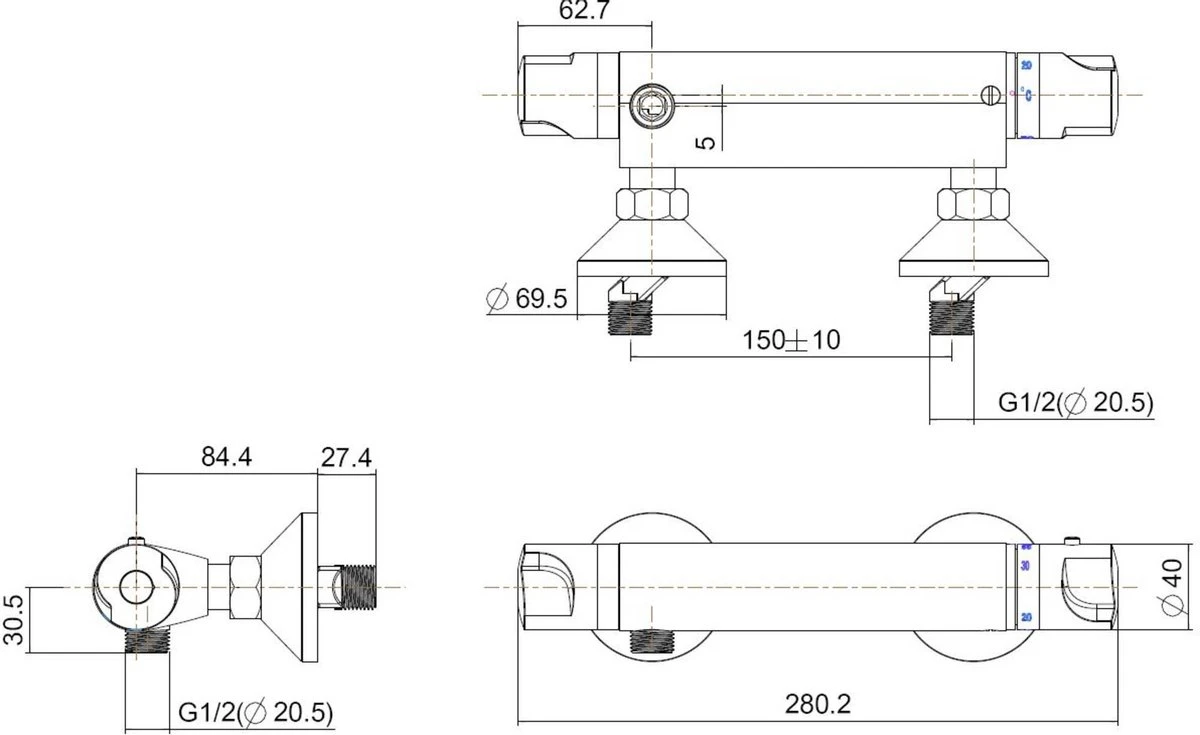 - • De chromen douchethermostaat is voorzien van twee grepen waarmee je de temperatuur en het watervolume regelt.