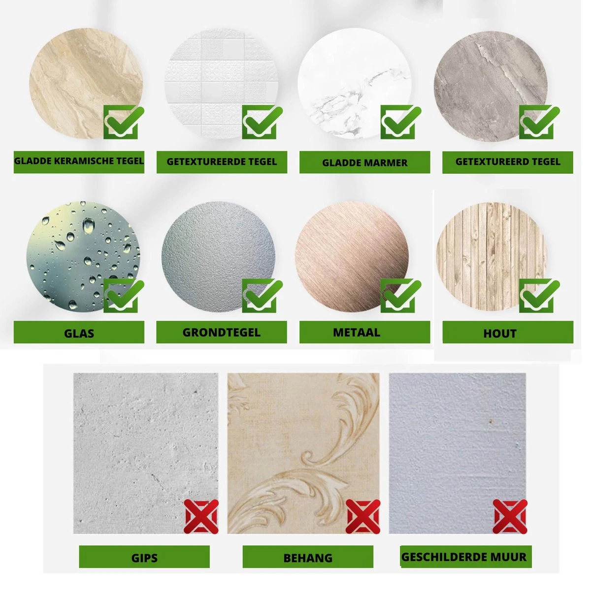 Zweedse meubelzaken kunnen zelfs nog wat leren van deze simpele constructie! Je hoeft overigens ook niet per se te boren in je pas gestucte of betegelde muur, in het pakket vind je een oersterke zelfklevende plakstrip.