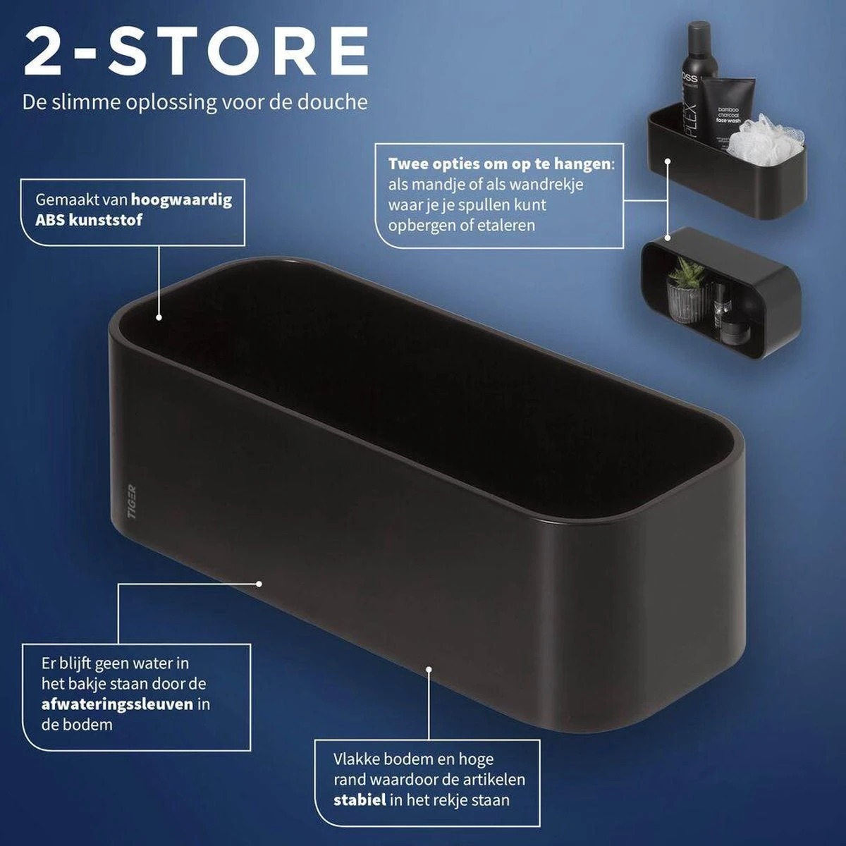Met deze slimme oplossing van Tiger kun je nog meer ruimte in je badkamer creëren voor het opbergen of etaleren van al je badkamerspulletjes. Dit wandbakje uit de 2-Store collectie geeft je twee opties: gebruik hem als douchemandje in de douche of bij het bad, of als wandrekje in je toilet of badkamer.