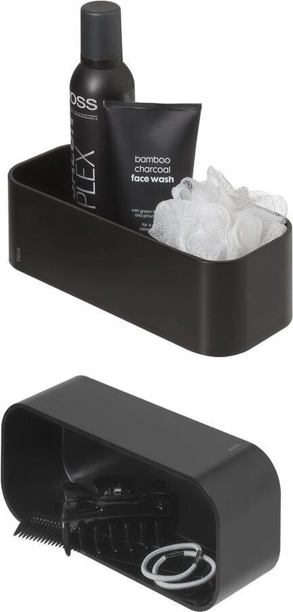 Schuif het bakje op het muurplaatje en je kunt altijd afwisselen. Het wandbakje is gemaakt van kunststof en kan dus niet roesten. Door de waterafloop onderin kun je het bakje gemakkelijk schoonhouden zodat het douchemandje jarenlang mooi blijft. De zwarte kleur geeft een stoere twist aan je badkamer en is makkelijk te combineren met andere accessoires.