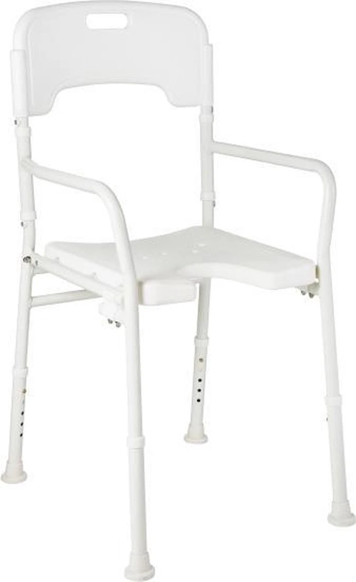 Specificatie’s Van De Drive Opvouwbare Douchestoel Merk : Drive Type : Douchestoel Opvouwbaar : Ja Kleur : Wit Maximaal gebruikersgewicht : 110 kg Zithoogte verstelbaar : Ja van 45 – 53 cm Totale hoogte inclusief rug : 96 – 104 cm Zitbreedte : cm Zitdiepte : 43 cm Totale Breedte : 51 cm Totale Diepte : 45 cm Gewicht : 5 kg